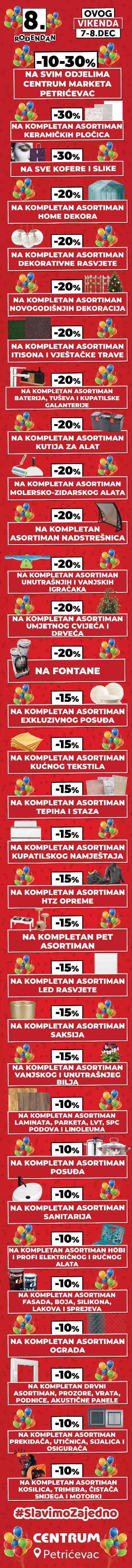 Centrum market na Petrićevcu ove godine slavi svoj rođendan i poziva sve svoje kupce na proslavu uz posebne popuste i zabavne aktivnosti! U periodu od 7. do 8. decembra, kupci mogu uživati u popustima do -30% na svim odjelima, uz dodatne iznenađenja i nagrade. Kako bi proslava bila još uzbudljivija, sve kupce pozivamo da okušaju sreću u igri Smajlijevo kolo sreće. Okrenite kolo i osvojite brojne nagrade – od dodatnih popusta do vrijednih poklona i kupona.