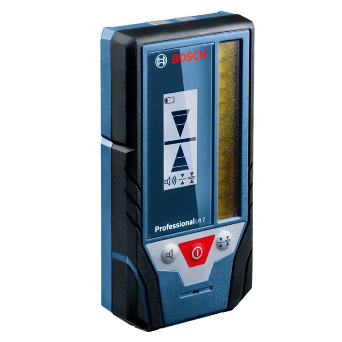 Laserski prijemnik LR 7. Detekcija zelenih i crvenih laserskih linija. Brzo prepoznavanje laserske linije s 8 cm prijemnim prostorom. Poravnavanje ravnine laserskog snopa, optički (zaslon i LED) i akustično, za rad u različitim uvjetima osvjetljenja. Prikladan prijemnik za domet do 50 m. Praktični prikaz sa svim potrebnim informacijama. Magneti na vrhu za bolje pričvršćivanje. Brzo i jednostavno pričvršćivanje na odgovarajući nosač bez vijka. Pogodno za GCL 2-50 C, GCL 2-50 CG.