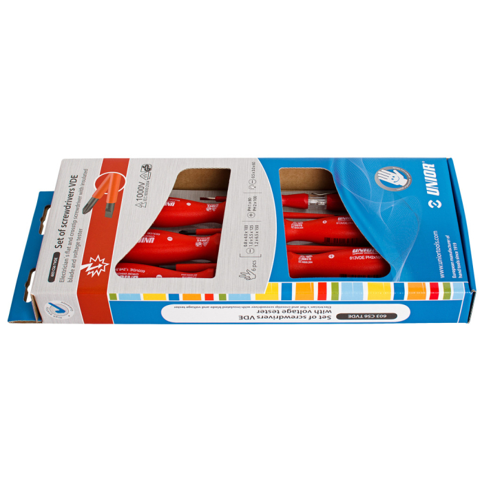UNIOR izvijači i ispitivač napona u garnituri VDE - ART. 603CS6TVDE alat je izoliran i ispitan u skladu s VDE propisima. Unior alat za rad pod naponom zadovoljava sve zahtjeve međunarodno priznatog europskog standarda EN 60900. Ovaj set alata uključuje izvijač i ispitivač. "5+1" može ukazivati na to da set sadrži pet različitih vrsta izvijača, plus dodatni ispitivač. Set se koristi se za različite zadatke, uključujući zatezanje i otpuštanje vijaka te testiranje električnih krugova.