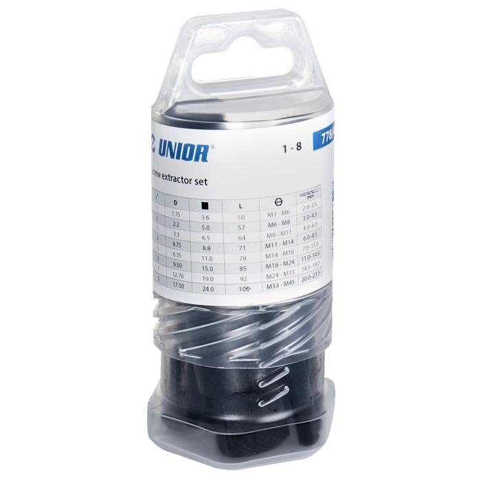 UNIOR set izvlakača polomljenih vijaka 1-8 - ART. 778/4PB pomno osmišljen dizajn i precizna izrada spriječavaju oštećenja radnih predmeta čak i pri značajnim opterećenjima. S takvim karakteristikama, Uniorov alat pravi je izbor za svakog majstora koji želi kvalitetan i dugotrajan alat.