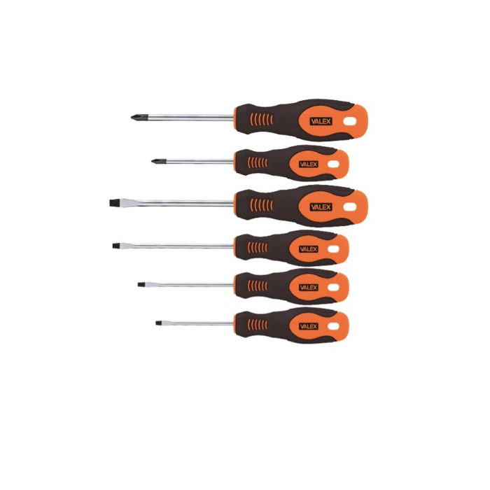 VALEX set izvijača 6 komada je odličan set izvijača visoke kvaliteta izrade koji su dodatno ojačani za duži vijek trajanja. Odličan alat svakog majstora.Četri odvijača sa prorezima 3x0.5mm, 3.5x0.5mm, 4.5x0.8mm, 5.5x1mm.Dva klizna odvijača PH1, PH2.