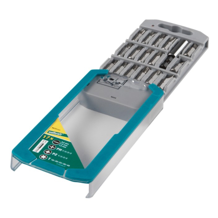 WOLFCRAFT set bitova sadrži:-3 puna bita, 25 mm, za vijke sa prorezom (0,6 x 4,5 mm / 1 x 5,5 mm / 1,6 x 8 mm)-4 puna bita, 25 mm, za Phillips® vijke sa glavom (PH 1 / 2 / 2 / 3)-4 puna bita, 25 mm, za Phillips vijke sa Pozidriv® pogonom (PZ 1 / 2 / 2 / 3)-5 čvrstih bitova, 25 mm, za vijke sa TORX® pogonom (T 10 / 20 / 25 / 30 / 40)-1" šesterokutni pogon (ISO 1173 - C 6.3 drška) za brzu promjenu alata i sigurno prianjanje u držač bitova