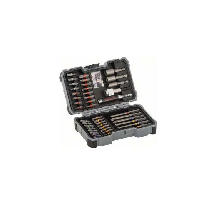 BOSCH set bitova i nasadnih ključeva 43dijelni za različite radove. Sadrži:-PH1, 2x PH2, PH3-PZ1, 2x PZ2, PZ3-SL3, SL4, SL5, SL6-H3, H4, H5, H6-TX10, TX15, 2x TX20, TX25, TX27, TX30, TX40-THX10, THX15, 2x THX20, THX25, THX27, THX30, THX40-Dugi PH2 / PZ2 / SL6 / T15, T20, T25-Ključ sa magnetom za vijke 6mm, 8mm, 10mm