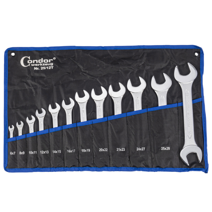 CONDOR set sa 12 komada viljuškastih ključeva, od hrom-vanadijum čelika. Isporuka u crnoj, izdržljivoj najlonskoj torbi. 6 x 7 mm, 8 x 9 mm, 10 x 11 mm, 12 x 13 mm, 14 x 15 mm, 16 x 17 mm, 18 x 19 mm, 20 x 22 mm, 21 x 23 mm, 24 x 27 mm, 25 x 28 mm, 30 x 32 mm.