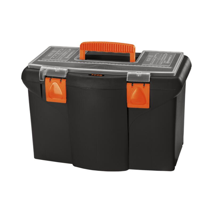 TOOD kutija za alat TB18B je napravljena od kvalitetnog materijala koji je pogodan za nošenje veće količine alata zahvaljujući svojim pregradama i jednoj ladici. Proziran poklopac kutije i udobna ručka za nošenje za dodatnu praktičnost. Dimenzije: 45x26x29 cm.
