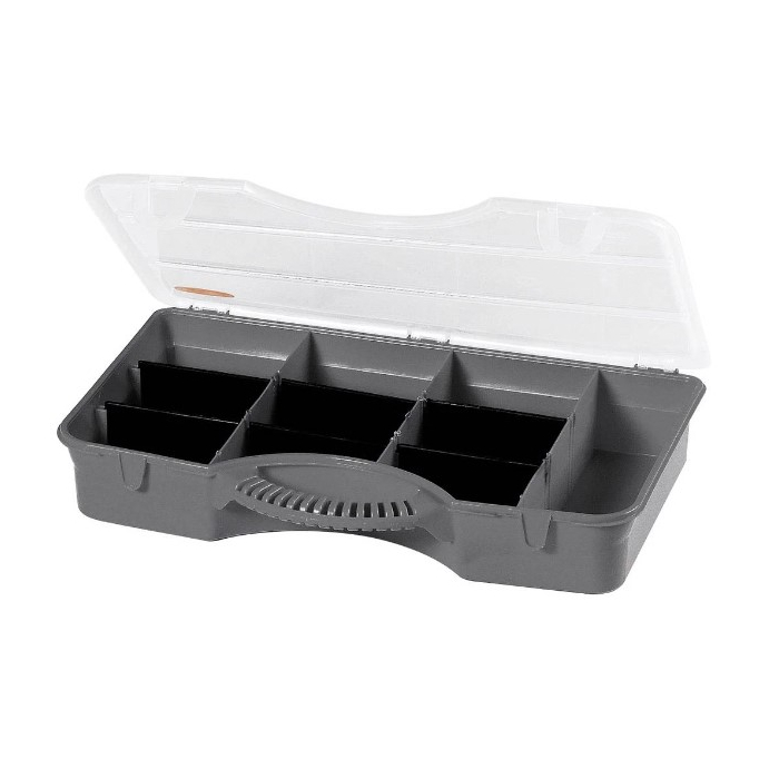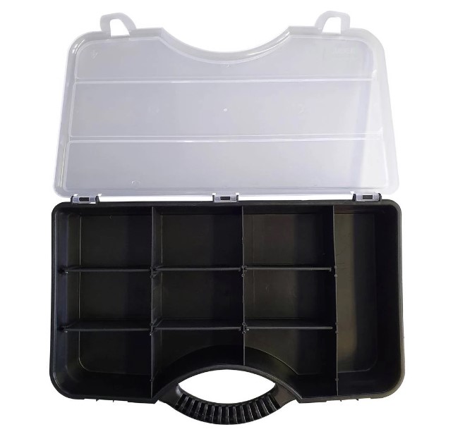 TOOD organizer 36 x 24 x 7 cm TO710, struktura sačinjena od plastičnog materijala vrlo otpornog na udarce. Sadrži pretinac za male dijelove s prozirnim poklopcem. Plastične kopče za zatvaranje, osigurava Vam pouzdanost.Dimenzije: 36 x 24 x 7 cm (d x v x š)Materijal: ABS PlastikaPosjeduje 10 pregrada (1 fiksna i 9 promjenjivih)