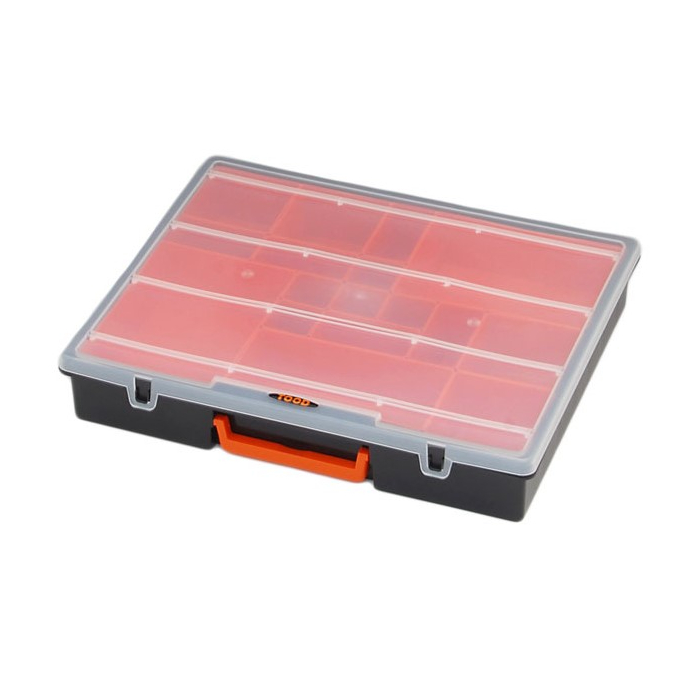 TOOD organizer 38 x 31 x 7 cm TO78, struktura sačinjena od plastičnog materijala vrlo otpornog na udarce. Sadrži pretinac za male dijelove s prozirnim poklopcem. Plastične kopče za zatvaranje, osigurava Vam pouzdanost.Dimenzije: 38 x 31 x 7 cm(d x v x š)Materijal: PP (Polipropilen)Posjeduje 17 pregrada:5 komada: 4 x 4 x 5,5 cm5 komada: 4 x 8 x 5,5 cm4 komada: 8 x 8 x 5,5 cm1 komada: 8 x 16 x 5,5 cm2 komada: 12 x 16 x 5,5 cm