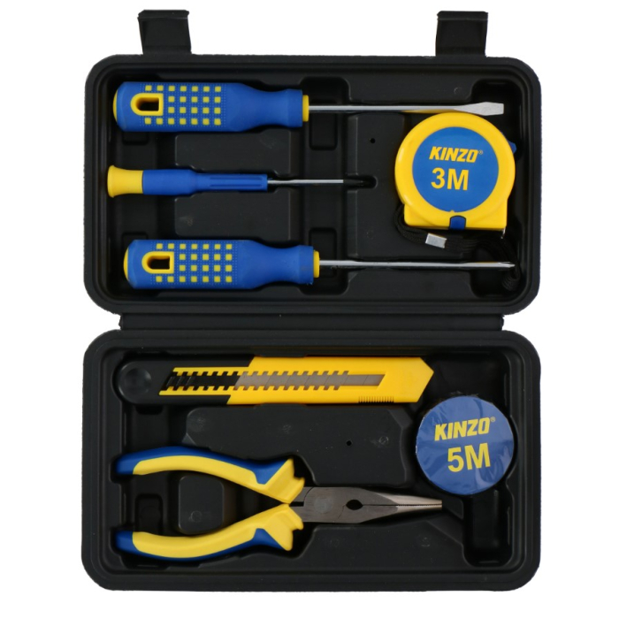 KINZO set ručnog alata 8 kom sadrži najvažnije alate za obavljanje malih poslova. 8 komada ručnog alata uredno je upakovano u čvrstu plastičnu kutiju. Tako da ne moraju da leže okolo u fioci i uvijek ih imate pri ruci. Alat je izrađen od čvrstog čelika i robusne plastike, što garantuje dug period korišćenja.Sadržaj seta:2x odvijačaStanley nož 18mmRolmetar 3 mRola trake 5m x 18mmKliještaPrecizni odvijač PH1x50mmTorbica za alat