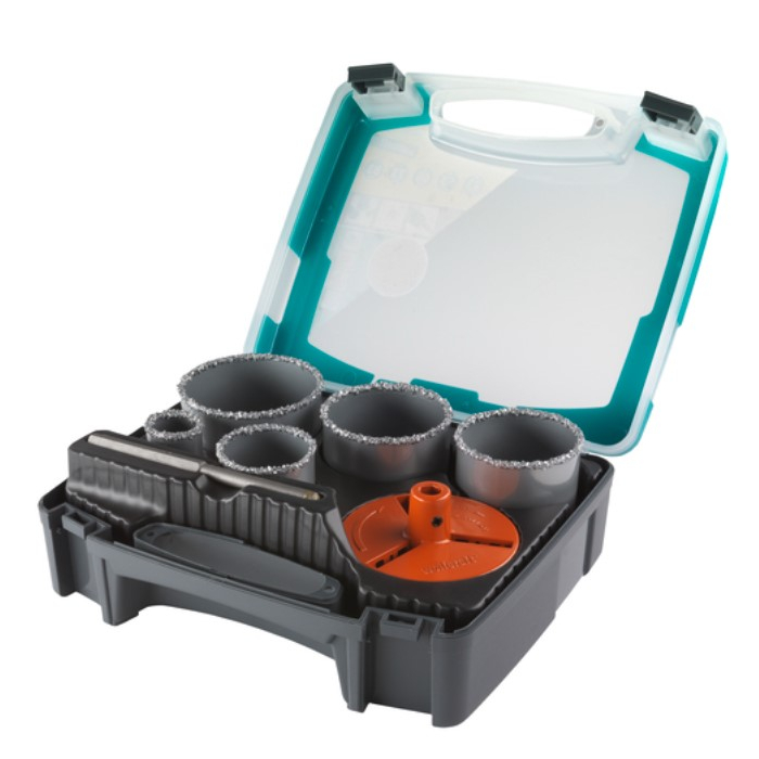 WOLFCRAFT alat za bušenje rupa za instalacije je set od 7 dijelova koji je idealan želite pripremiti vodovodne i električne instalacije i bušiti zidove i kamen. Sadrži 5 burgija sa karbidnim vrhom prečnika 33, 53, 68, 73 i 83 mm, centralno svrdlo (O 8 mm) i montažnu ploču. Sa dubinom rezanja od 55mm, možete postići precizne rupe.