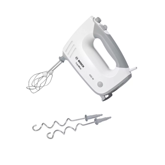 Ručni mikser ErgoMixx 450 W bijeli je praktičan kuhinjski uređaj za miješanje, tučenje i gnječenje sastojaka. Motor snage 450 W omogućava pouzdane rezultate u svakodnevnoj pripremi hrane. Ergonomska mekana ručka osigurava udobno i sigurno korištenje. Opremljen je turbo metlicama i kukama od nehrđajućeg čelika za optimalne performanse. Ima 5 brzina plus turbo funkciju za preciznu kontrolu, te jednostavan gumb za brzo izbacivanje pribora i lako čišćenje.