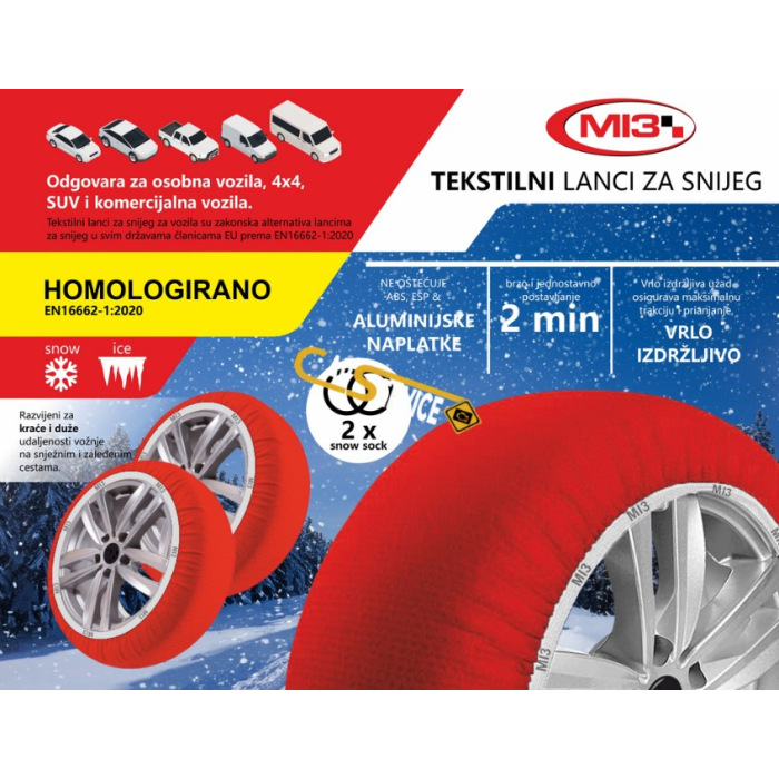 LANCI za snijeg tekstilni MI3 M su praktični i efikasni lanci koji omogućavaju bolju trakciju na snijegu i ledu. Napravljen od tekstilnog materijala, ovaj set lanci je lakši i jednostavniji za postavljanje od tradicionalnih metalnih lanaca, a pruža odličnu stabilnost i sigurnost prilikom vožnje u zimskim uslovima. Idealni su za upotrebu na vozilima srednje veličine, pružajući dodatnu sigurnost u sniježnim i zimskim uslovima.