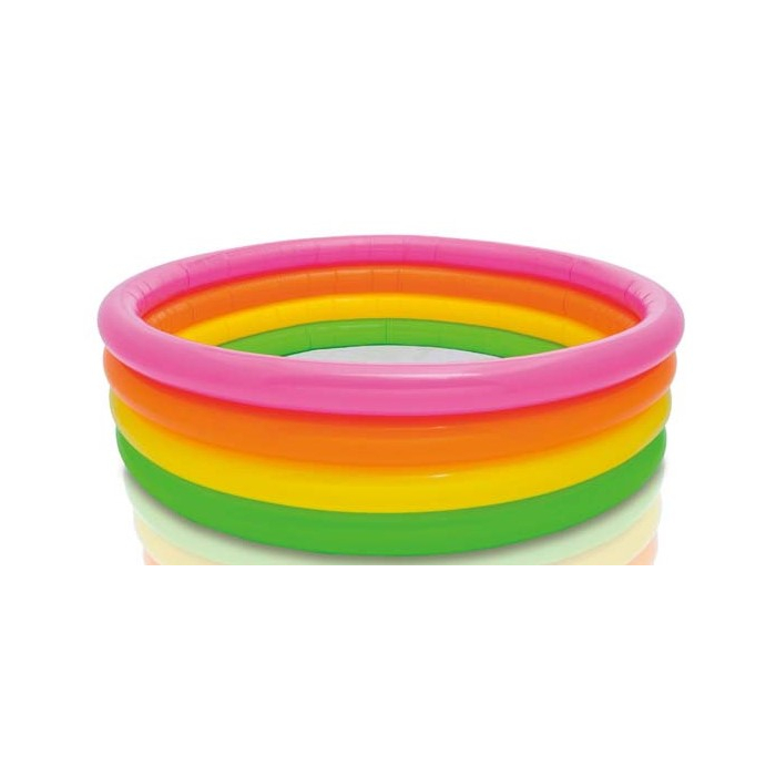 INTEX bazen Sunset Glow Pool dječiji okrugli atraktivnih duginih boja koja donosi radost i rashađenje u ljetnom periodu. Ima 4 vazdušna prstena sa duplim ventilima. Zapremina bazena 780L. Dimenzije: 168x46cm.