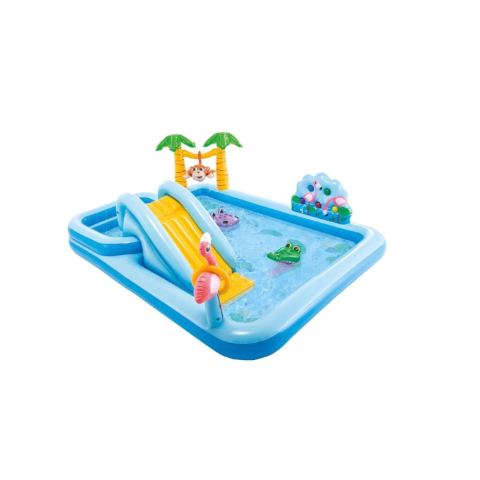INTEX igraonica dječija na naduvavanje Jungle je raj za igru. Postoji nekoliko životinja iz džungle, kao što su nilski konj, krokodil, majmun i flamingo. Bazen za igru ima i pravi tobogan i fontanu za osvježenje. Sastoji se od dva bazena koja su povezana toboganom. Mali bazen ima prelivni ventil, tako da nikada ne može da sadrži više od 11cm vode, pa je pogodan i za malu djecu. Dimenzije: 257x216x84cm