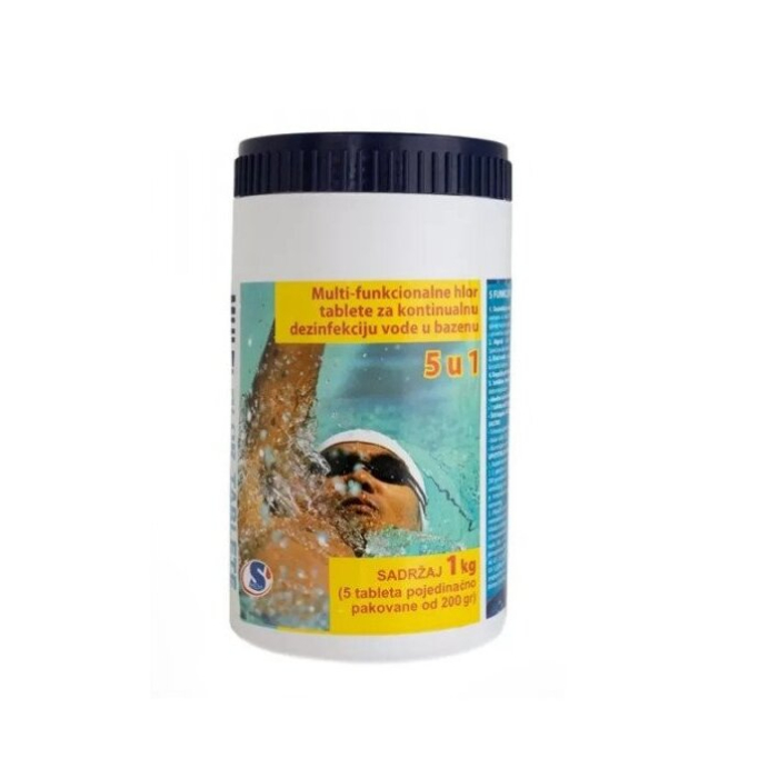 HLOR tablete 5u1 1kg sadrži stabilizovani hlor koje se polagano rastvara u vodi, vrši dezinfekciju vode i uništava viruse i bakterije koji se nalaze u vodi. Sadrži sredstvo koje sprečava rast i razvoj algi. Potrebno 1-2 tableta na 10m3.