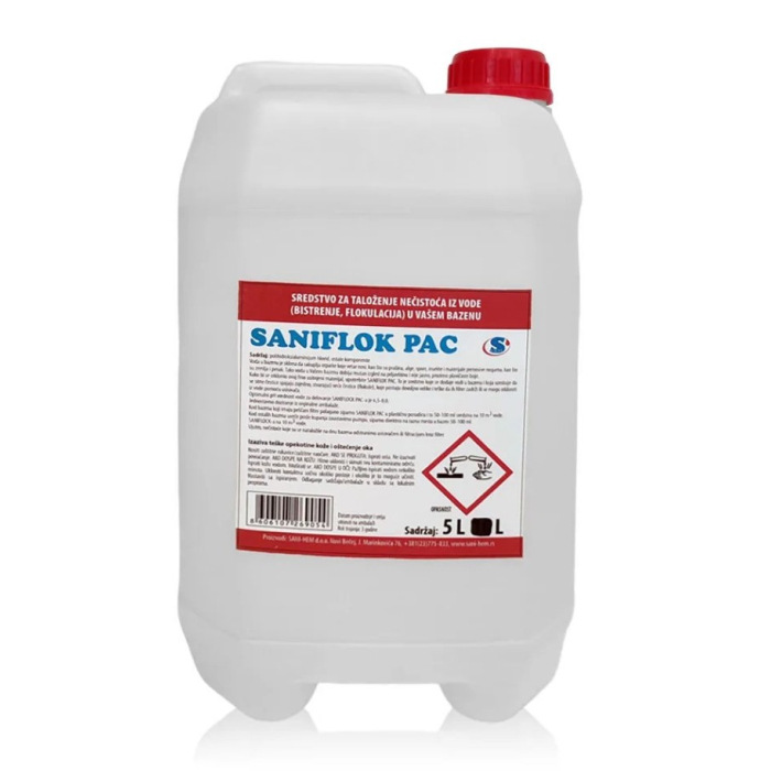 SREDSTVO saniflok 100ml – Tečni flokulant na bazi polihidroksi aluminijum hlorida, efikasno uklanja mutnoću iz bazenske vode. Sitne čestice povezuje u veće (flokule) koje padaju na dno bazena i lako se uklanjaju usisivačem. Pogodno za pH vrednost 6,5–8,0. Netoksično i bezbedno za kožu. Pakovanje: 100 ml.
