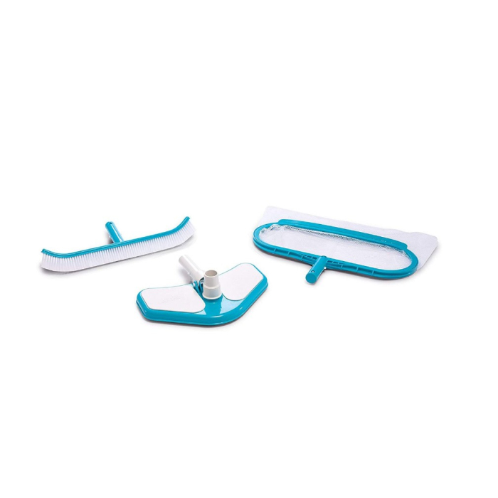 INTEX set za održavanje bazena je jednostavan za korištenje, a efikasno će se pobrinuti o higijeni vašeg bazena. Ovaj komplet uključuje izdržljivu i duboku mrežu za listove, zakrivljenu zidnu četku i vakumsku glavu. Vakuum usisava ostatke sa dna bazena i kroz filter. Zakrivljena zidna četka može brzo ukloniti alge i prljavštinu sa zidova bazena ili dna bazena.