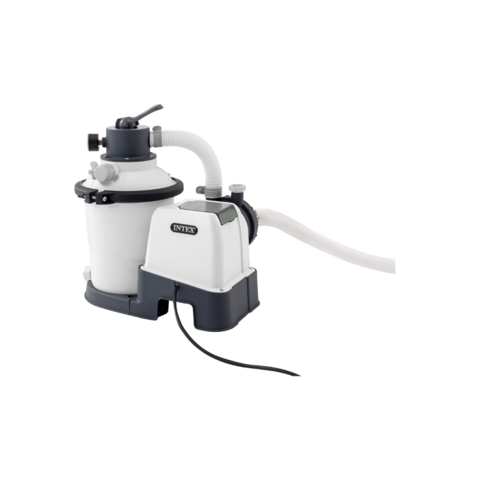 INTEX pješčana pumpa za bazene – Namijenjena za bazene do 4,57 m, nudi snažnu filtraciju uz minimalno održavanje. Protok 3,5 m3/h, rezervoar 203 mm, kapacitet pjeska 6,5 kg. Ima 6 funkcija: filtriranje, pranje, ispiranje, recirkulacija, ispuštanje i zatvaranje. Hidro Aeration tehnologija dodatno poboljšava kvalitet vode. Radi na 220–240 V. Pogodna za većinu Easy Set, Frame i Prisma bazena.