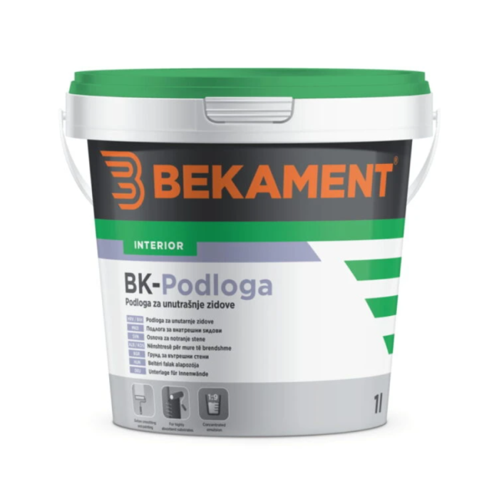 BEKAMENT podloga za unutrašnje zidove 1:9 1 l je disperziona impregnacija namijenjena za pripremu unutrašnjih zidnih površina prije bojenja ili malterisanja. Poboljšava prianjanje završnih slojeva, ujednačava upojnost podloge i smanjuje potrošnju boje. Razrjeđuje se u odnosu 1:9 sa vodom, lako se nanosi i pogodna je za gips, malter i beton. Idealna je za kvalitetnu pripremu zidova prije završne obrade.