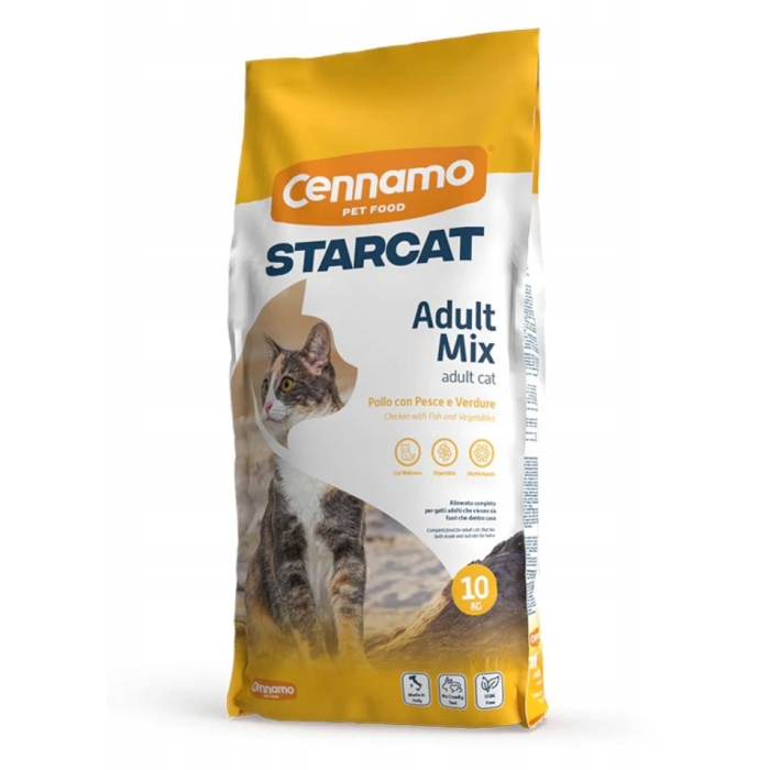 CENNAMO hrana za mačke Adult Starcat Mix 10 kg je kompletna suha hrana namijenjena za odrasle mačke. Formulisana je da obezbijedi uravnotežen unos proteina, vitamina i minerala potrebnih za svakodnevnu vitalnost i dobro zdravlje. Sadrži kombinaciju mesnih i biljnih sastojaka koji doprinose dobroj probavljivosti i prihvatljivosti ukusa. Pogodna je za mačke koje žive u zatvorenom i na otvorenom prostoru, uz podršku održavanju energije i kondicije.