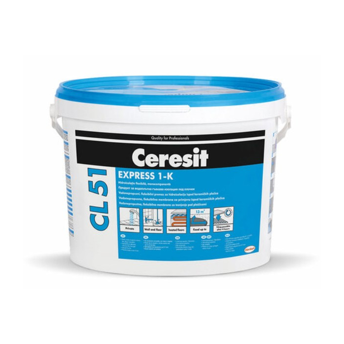CERESIT premaz za hidroizolaciju 1K 5/1 CL51 je fleksibilni jednokomponentni hidroizolacioni premaz namijenjen za zaštitu površina ispod keramičkih pločica u vlažnim prostorima poput kupatila i kuhinja. Vodonepropustan je, spreman za upotrebu i premošćuje pukotine. Brzo se suši i omogućava postavljanje pločica već nakon oko 4 sata, uz jednostavno nanošenje četkom ili valjkom.