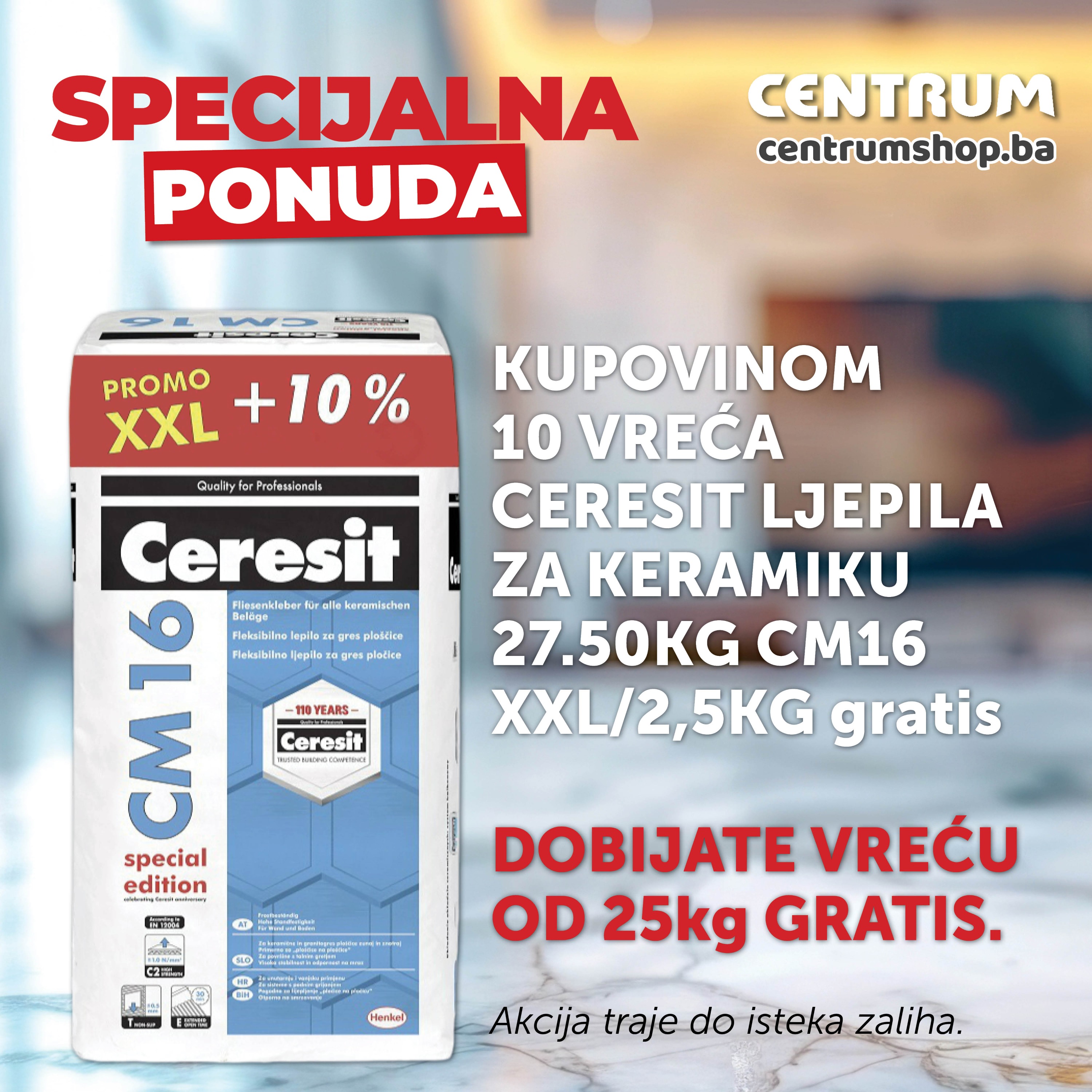 Kupovinom 10 vreća CERESIT ljepila za keramiku od 27.5 kg CM16 XXL, dobijate dodatnu vreću CERESIT ljepila od 25 kg potpuno BESPLATNO!