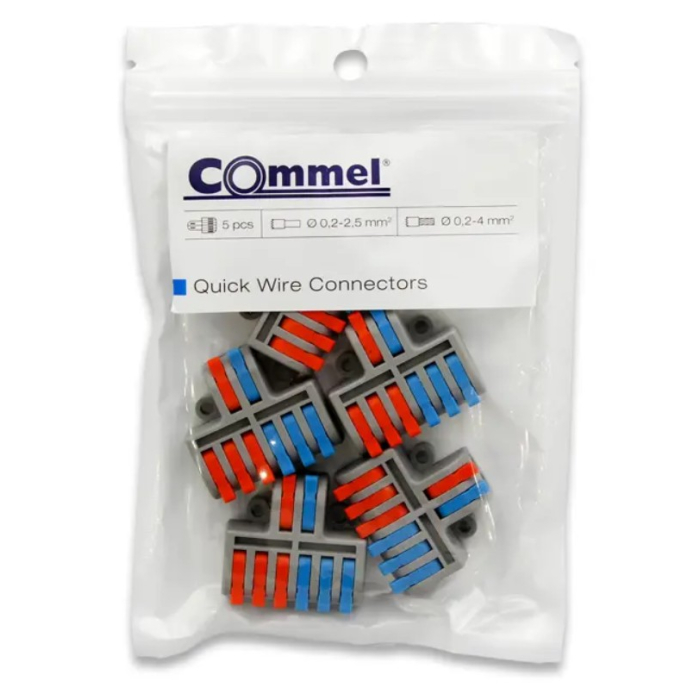 COMMEL spojnica brza 2/6 5/1 je kvalitetna instalaciona brza spojnica namijenjena za jednostavno i sigurno povezivanje električnih provodnika. Omogućava brzo spajanje bez alata, uz pouzdan kontakt i stabilnu vezu u razvodnim kutijama i instalacijama. Pogodna je za različite presjeke provodnika, uz praktičnu primjenu u kućnim i profesionalnim elektroinstalacijama. Izrađena je od izdržljivih materijala koji obezbjeđuju dug vijek trajanja i sigurnost u radu.