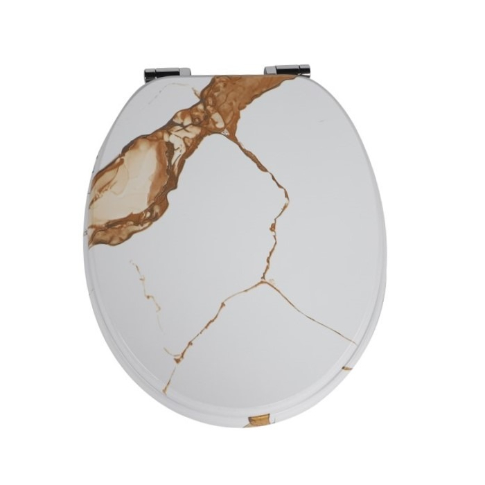 DECOSTRONG WC daska GJ-24 Calacatta Gold donosi elegantan i luksuzan izgled kupatilu zahvaljujući dekoru bijelog mramora sa zlatnim detaljima. Izrađena je od kvalitetnog i izdržljivog materijala koji osigurava dugotrajnu upotrebu i jednostavno održavanje. Stabilni metalni okovi omogućavaju sigurno pričvršćivanje, čineći je praktičnim i pouzdanim izborom za svako kupatilo. Materijal: MDF