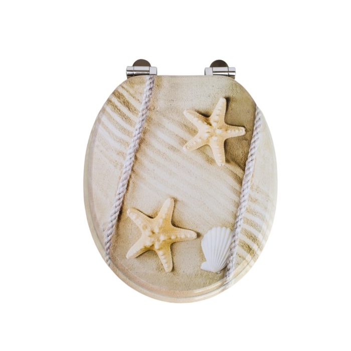 DECOSTRONG WC daska H139 donosi dekorativan i osvježavajući izgled kupatilu zahvaljujući motivu morskih zvijezda i školjki. Izrađena je od kvalitetnog i izdržljivog materijala koji osigurava dugotrajnu upotrebu i jednostavno održavanje. Stabilni metalni okovi omogućavaju sigurno pričvršćivanje, čineći je praktičnim i pouzdanim izborom za svako kupatilo. Materijal: MDF