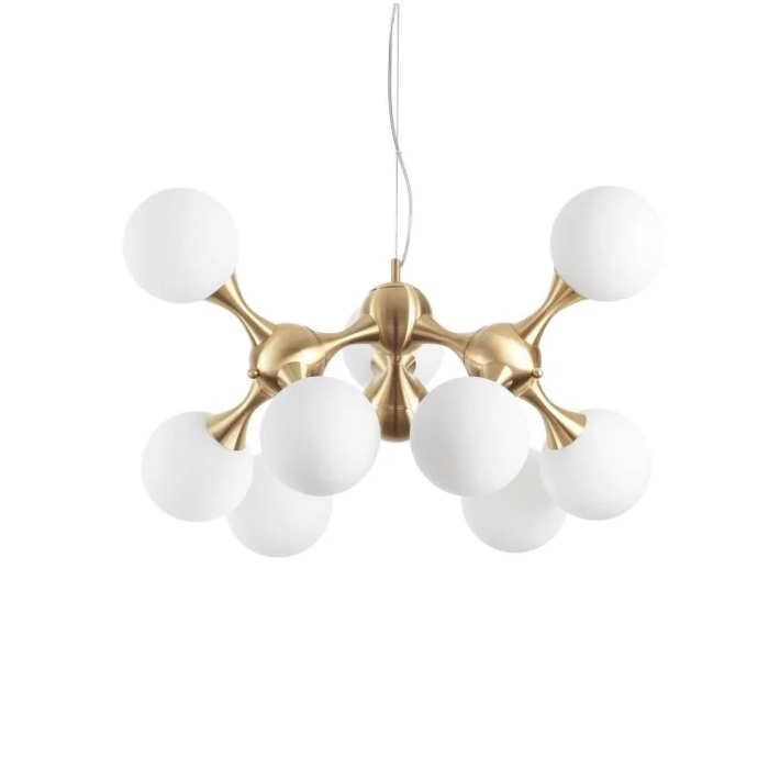 IDEALelegantna je viseća svjetiljka koja kombinuje moderan dizajn i funkcionalnost. Izrađen od metala i stakla u satenski mesinganoj i bijeloj boji, unosi sofisticiranost u prostor. Sa devet E14 grla (max 40W), pruža snažno i ravnomjerno osvjetljenje, idealno za veće prostorije. Podesiva visina (53–262 cm) olakšava prilagođavanje enterijeru. Precizan dizajn i kvalitetna izrada čine ga savršenim izborom za stilizovane domove.Dimenzije (vxšxd): 400x800x800mm