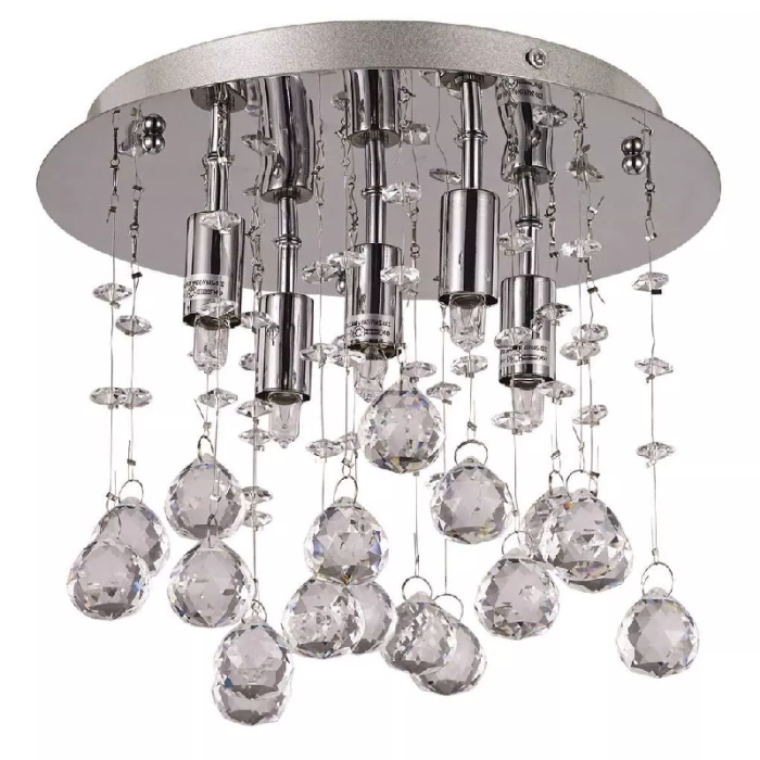 LUSTER Ideal Lux Moonlight pl5 chromo ukrašen sa kristalnim privescima. Luster ima okrugli okvir i držač od hromiranog metala. Dimenzije: Prečnik 260 x V 200 mm. G9 max 5 x 40W.