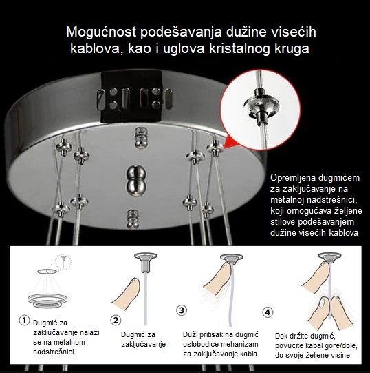 Ovaj luster je opremljen dugmićima za zaključavanje koje su jednostavne za upotrebu te Vam omogućavaju da promijenite visinu svjetiljke u bilo kojem trenutku nakon što je uređaj instaliran.