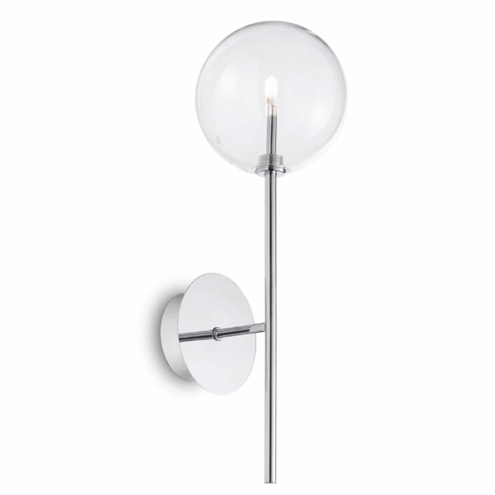 LAMPA zidna Ideal Lux Equinoxe ap1 Cromo, minimalistička zidna lampa sastavljena od kružnog zidnog držača, tankog nosača i malog sfernog difuzora od providnog duvanog stakla. Okvir i ruka su izrađeni od metala sa hromiranim mesingom. Dimenzije: 130 x 300 x 180 mm, G4 max 1 x 2W.