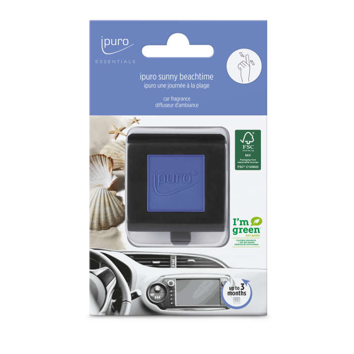 MIRIS za auto Ipuro Essentials Sunny Beachtime asocira na ljeto, sunce, more i divno opuštajući dan na plaži. Gornje note mirisa: grejpfrut, limun, menta. Srce mirisa: jasmin, ljiljan, ruža. Donje note: bijeli mošus, mahune tonke. Ipuro je vrhunska linija mirisa i osvježivača vazduha.