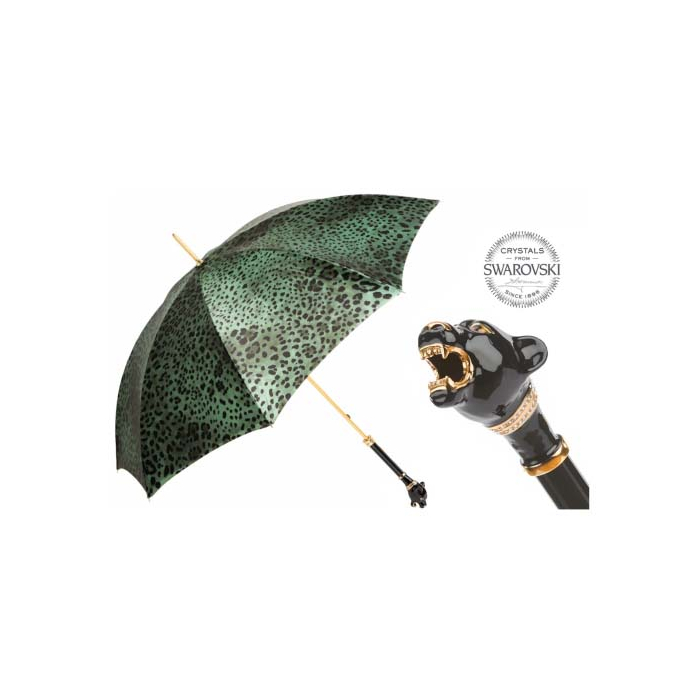 Ovaj luksuzni kišobran dugačak je 93cm i prečnika je 102cm kada se otvori. Njegova jedinstvena drška na svom kraju ima glavu leoparda crne boje sa ogrlicom od Swarovski kristala i ukrasima boje zlata. Materijal tkanine je satenski poliester. Prsten na vrhu drške kišobrana je pokretan i služi kao zaštita za žice kišobrana kada je zatvoren. Dolazi u crvenoj poklon kutiji sa drškom.