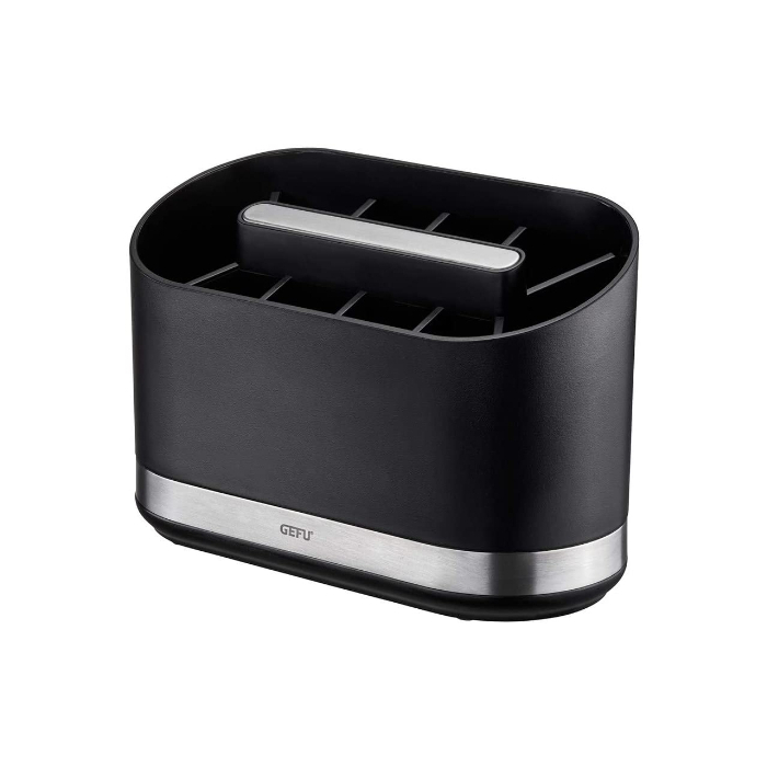 GEFU stalak SMARTLINE - ova moderna posuda za suđe ima 10 pregrada koji nude prostor i za mala i za velika kuhinjska pomagala. Umetan uložak olakšava čišćenje. Osnovna ploča namjerno dizajnirana da bude teška, a neklizajuće noge da daju stabilnost.