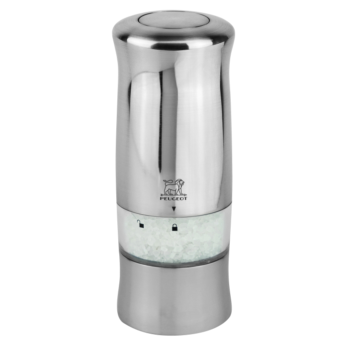Unesite modernu notu svom stolu i svojoj kuhinji uz električni mlin za so Peugeot Zeli i njegovu završnu obradu od brušenog nehrđajućeg čelika. Zeli električni mlin za so je i veoma praktičan i izuzetno efikasan. Kompaktne veličine, ovaj mlin na baterije, visok 14 cm, savršeno staje u vašu ruku. Jednostavno pritisnite gornje dugme za rad. Lampica se pali istovremeno radi bolje kontrole izlaza paprike. Podesite grubost mlevenja pomoću točkića koji se nalazi ispod mehanizma. Oslobađa maksimalan ukus i aromu tako što prvo razbije svako zrno bibera pre nego što se melje. Apsolutno zadovoljstvo za korištenje, Zeli električni mlin za so dolazi sa 6 baterija i 1 rezervnom sijalicom.