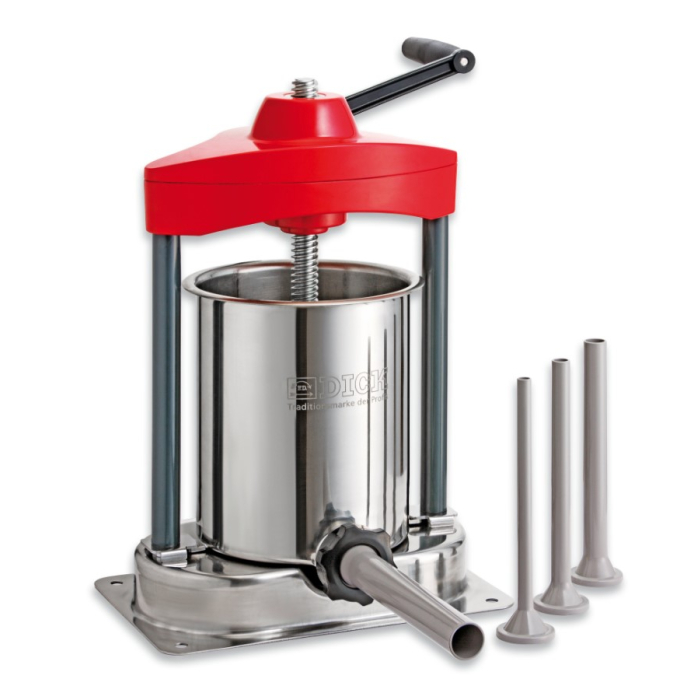 DICK top za kobasice HTW II zapremine 6,8L omogućava jednostavno i precizno punjenje kobasica. Opremljen sa četiri različita nastavka, prilagođava se različitim vrstama kobasica i debljinama, pružajući profesionalne rezultate svaki put. Čvrsta konstrukcija i lagano rukovanje čine ga idealnim za mesare i entuzijaste koji žele kvalitetan alat za pripremu domaćih kobasica.