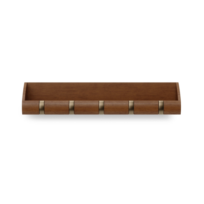 UMBRA zidna vješalica boja oraha širine 43 cm i visine 8 cm, sa pet preklopnih kuka i velikim pretincem za stvari kao što su vaši ključevi, novčanik, pošta i još mnogo toga. Elegantna je i velikog kapaciteta. Materijal: drvo.