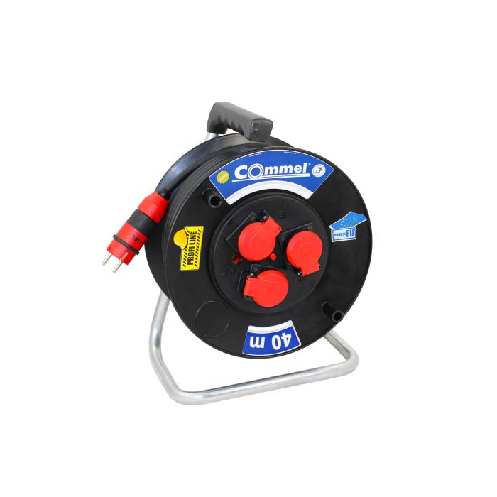 COMMEL motalica kablovska PVC 40m je motalica kablovska monofazna na PVC bubnju prečnika280mm, tri monofazneutičnice i kablom dužine 40mPresjek kabla je 3x2,5mm H05RR-F max.3500W,16A.Motalica je u IP44 zaštiti.