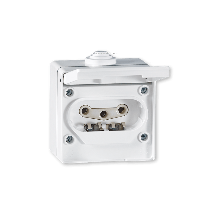 ALING CONEL utičnica 3-fazna og PVC je trofazna utičnica sa porculanskim jezgrom za montažu na zid .Nominalni struja/napon: 16A / 440V~.Dimenzije (d, v, š): 76mm x 76mm x 56mm.Stepen zaštite: IP 54.