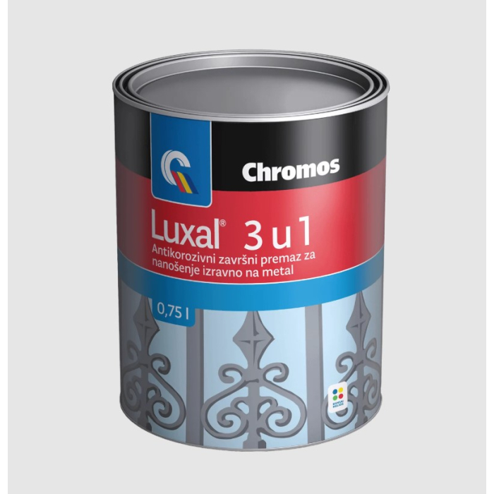CHROMOS lak emajl 3u1 tamno zeleni 0,75L Luxal uljani je univerzalni antikorozivni završni premaz na bazi alkidnih smola, namijenjen za zaštitu metalnih površina. Djeluje kao temeljni, međuslojni i završni premaz u jednom. Otporan je na atmosferske uticaje, dimne plinove i temperaturu do 120°C (za tamne tonove). Ima odličnu elastičnost, tvrdoću i dugotrajnu zaštitu.