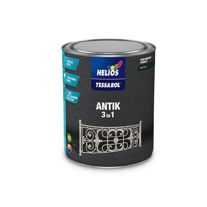 HELIOS lak emajl antik 3u1 srebrni 0,7L Tessarol je zaštitno-dekorativna boja s rustikalnim antik efektom, namijenjena za metalne površine poput ograda, kapija, rešetki i elemenata od kovanog željeza. Djeluje kao temeljni, međuslojni i završni premaz u jednom, pružajući efikasnu zaštitu od korozije i atraktivan izgled. Pogodna je za unutrašnju i vanjsku primjenu. Pakovanje od 0,75L pokriva 8–10 m2 u jednom sloju. Idealan izbor za dekoraciju i dugotrajnu zaštitu metala.