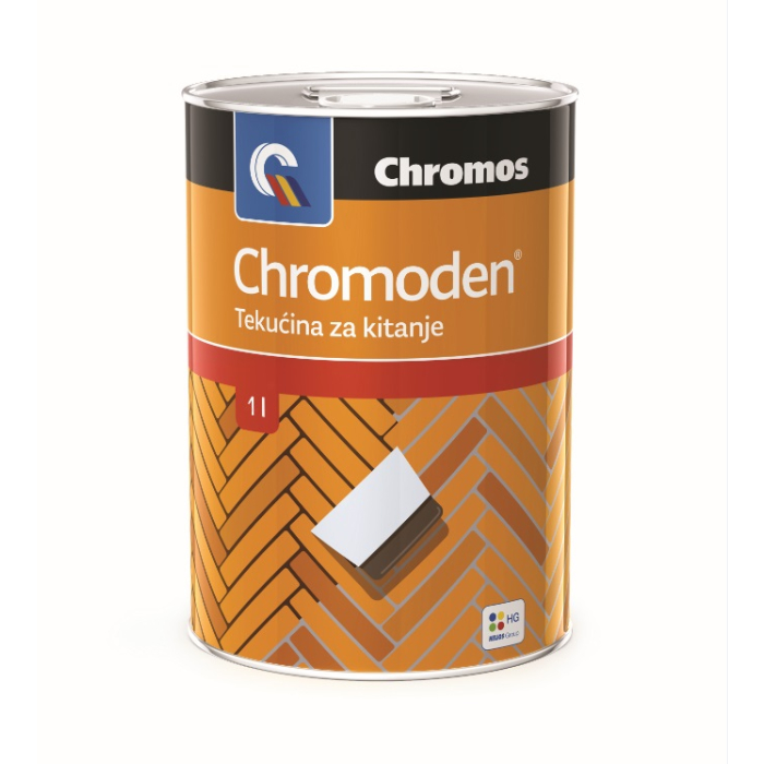 CHROMOS sredstvo za kit.parketa 1/1 Chromoden je brzosušiva, jednokomponentna bezbojna tekućina izrađena na osnovi visokokvalitetnih modificiranih veziva. Primjenjuje se kao tekućina za grubo kitanje odnosno zapunjavanje većih i manjih pukotina kod površinske obrade drvenih podloga. Ne razrjeđuje se