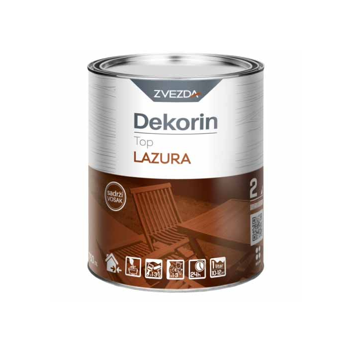 ZVEZDA lazura sa lakom Dekorin mahagoni 0,75l- je debeloslojna lazura, naročito je primjerena za zaštitu drveta koje je izloženo jačim klimatskim uticajima. Niže temperature, veća vlažnost vazduha, kao i tretman poslije premazivanja (ako će biti pod mehaničkim opterećenjem) produžuju vrijeme sušenje