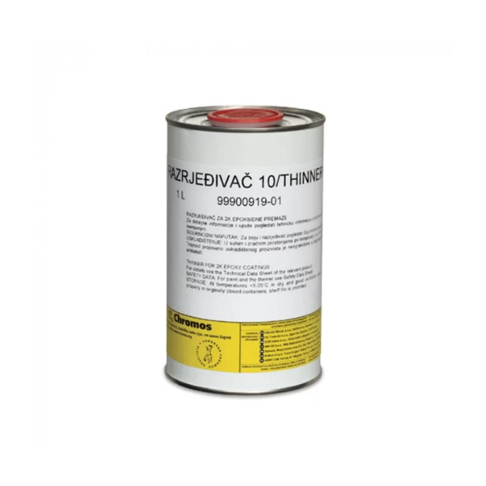 CHROMOS razrjeđivač 10 za Vinilux 1L je smjesa organskih otapala, a koristi se za razrjeđivanje Vinilux EP boje za bazene na viskoznost prikladnu za nanošenje u omjeru i na način predviđen uputama. Važno je da lak boja pri razrjeđivanju ima temperaturu primjene 18C – 20C.Karakteristike:- Za nanošenje kistom ili valjkom dodati 5 – 15 vol.- Razrjeđivanje za nanošenje na beton (valjak) je za prvi sloj oko 15% razrjeđivača, a za drugi sloj od 5 do 10%