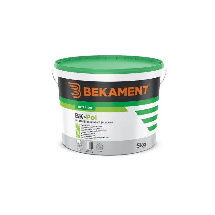 BEKAMENT disperzija za unutrašnje zidove BK- Pol je disperziona boja na bazi visokokvalitetne polimerne emulzije, namijenjena za unutrašnju upotrebu. Posjeduje odličnu pokrivnu moć i paropropusnost, otporna na suvo brisanje. Može se tonirati u preko 900 nijansi.