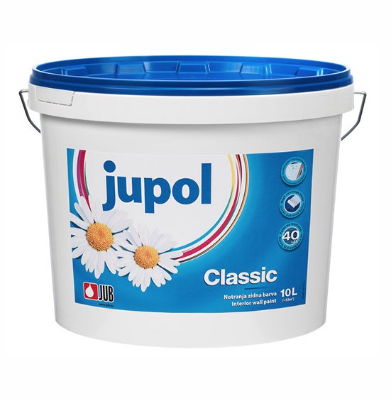 JUB Jupol Classic 10L se upotrebljava za dekorativnu zaštitu zidova i stropova u stambenim i poslovnim zgradama. Nova poboljšana formula unutrašnje boje omogućava razrjeđivanje sa vodom do 15% i lakše nanošenje, te postizanje elastičnosti boje bez vidljivih tragova valjka. Površine prebojane Jupol Classic bojom imaju finiju strukturu.Pakovanje: 10l