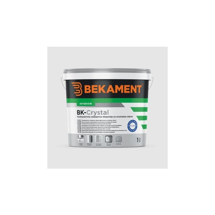 BEKAMENT vodoperiva akrilna boja za unutrašnje zidove Crystal, je disperziona boja za unutrašnje zidove izrađena na bazi visoko kvalitetne akrilne emulzije. Otporna je na vlažno brisanje i ima odličnu pokrivnu moć.Težina: 1 L