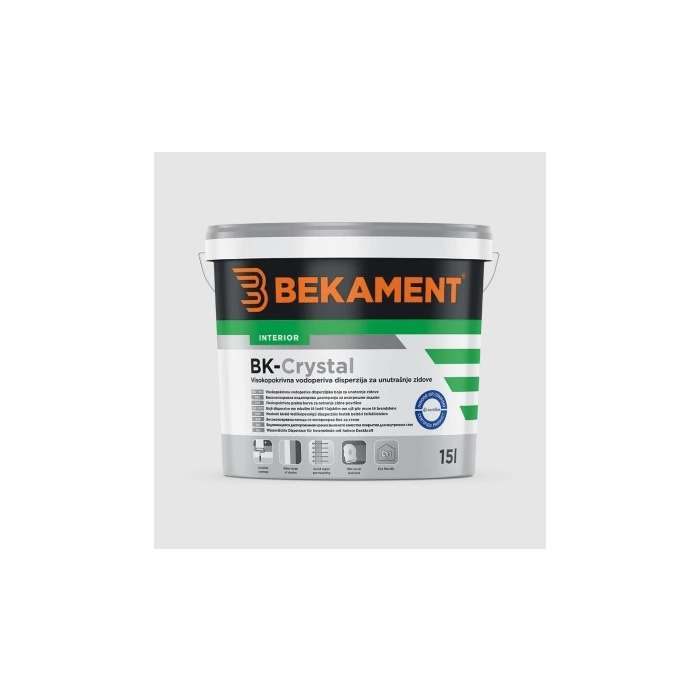 BEKAMENT vodoperiva akrilna boja za unutrašnje zidove Crystal, je disperziona boja za unutrašnje zidove izrađena na bazi visoko kvalitetne akrilne emulzije. Otporna je na vlažno brisanje i ima odličnu pokrivnu moć.Pakovanje: 5 L