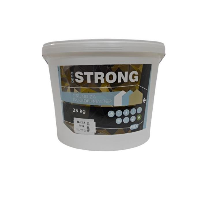 DECO STRONG grund za fasadni materijal 25kg je podloga za žbuku-grund namijenjen za pripremu vanjskih i unutrašnjih zidnih površina prije nanošenja svih vrsta dekorativnih fasadnih žbuka. Daje ujednačenu upojnost i strukturu podloge, poboljšava prijanjanjem, osigurava čvrstu vezu i ravnomjernu nijansu završne obrade. Vrijeme sušenja grunda je 24 sata. Ne preporučuje se korištenje po jakom suncu, vjetru, magli i kiši.
